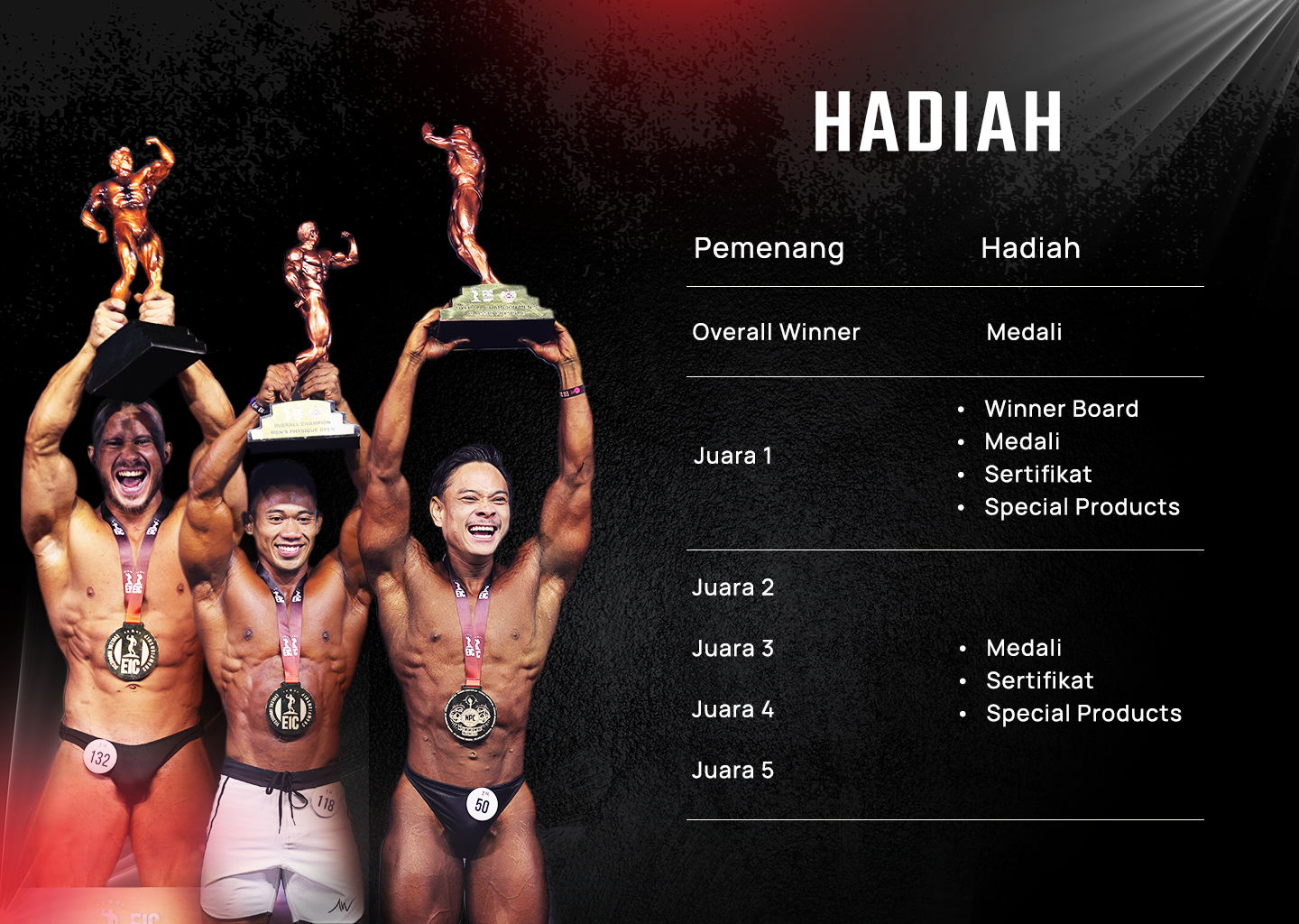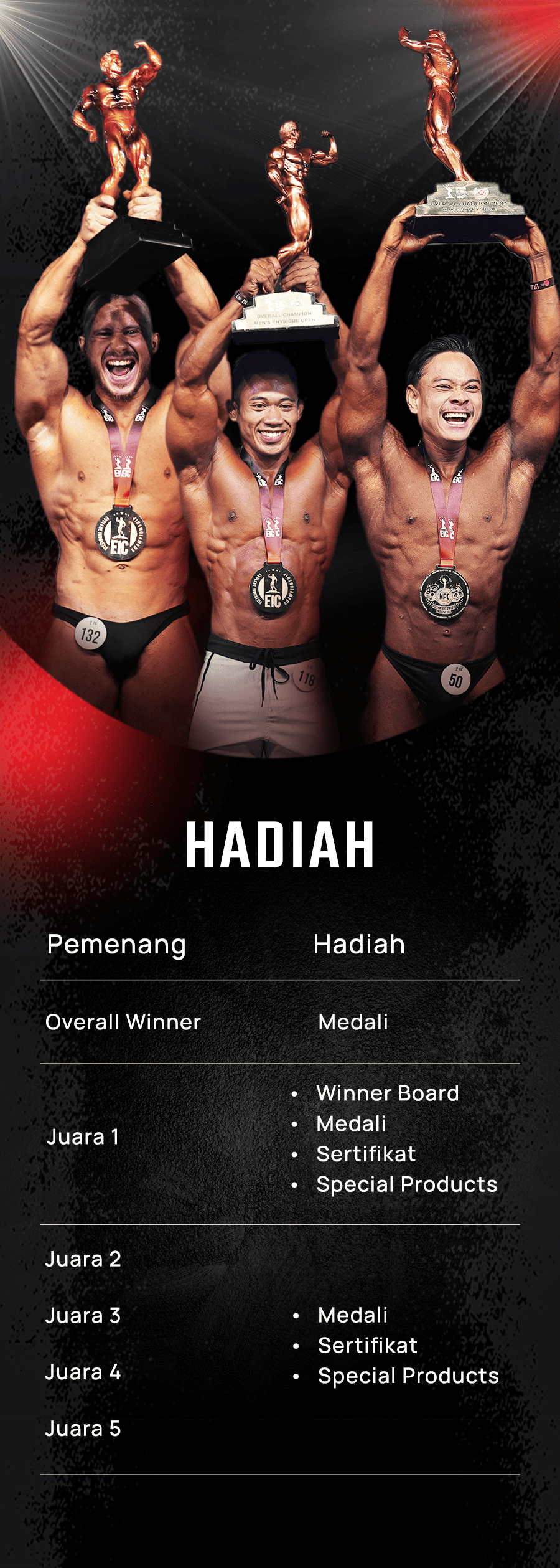 Overall champion (Men's Physique Open Class, Men's Classic Physique, Men's Bodybuilding) will be entitled to 3 golden tickets/sponsors for the next international match, winner board and also special products.